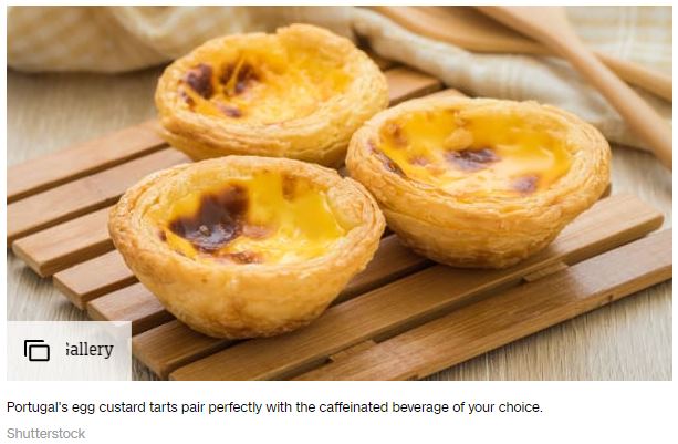 비록 많은 포르투갈인들이 간단하게 토스트나 빵을 음료와 함께 먹지만, 이 우유를 많이 넣은 커피에 짝이 잘 맞는 것은 파스테이스 데 나타(:pasteis de nata)라는 에그 카스타드 타르트입니다. 벗겨지기 쉬운 퍼프 페스츄리 껍데기와 카스타드 크림을 넣어서 그것은 포르투갈인의 또 다른 아침 의식인 오전 11시 카페 휴식 시간에 스낵만큼 동등하게 유명합니다.