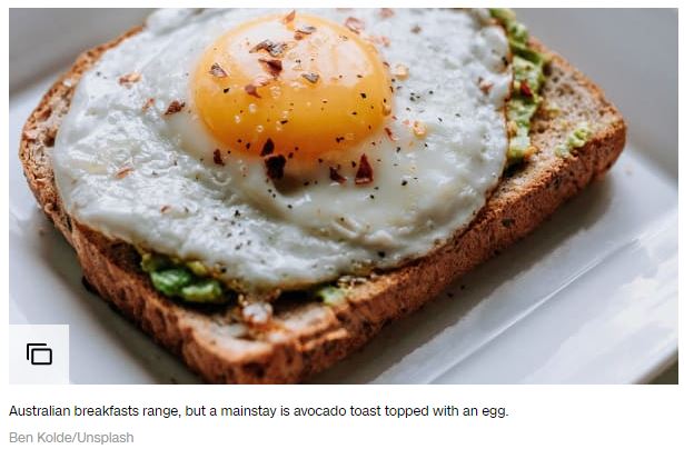 신선한 생산물인 통 곡물과 영양가 있는 것들의 조합으로, 오스트레일리아 사람들의 아침의 영역은 고전적인 아보카도 토스트로부터 삶은 계란을 토핑한 파로 보울, 절인 채소 또는 요거트 푸딩, 씨앗들과 베리류로 되어 있습니다.