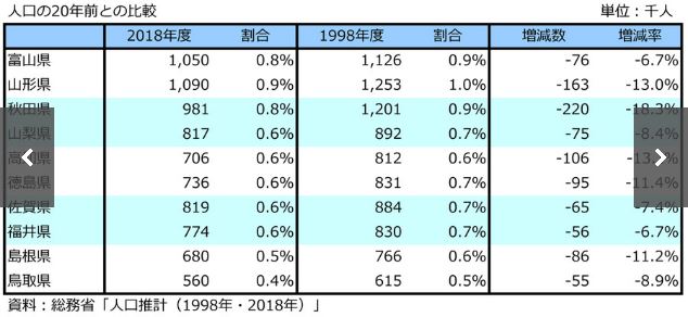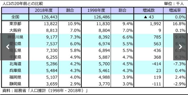 20년전과 비교 해보면 20개 도도부현 모두 주택수가 늘었습니다만, 그렇게 사는 사람이 늘어있는지 확인하기 위해서, 동시기의 인구 변화도 조사해서 표로 만들어 보았습니다.