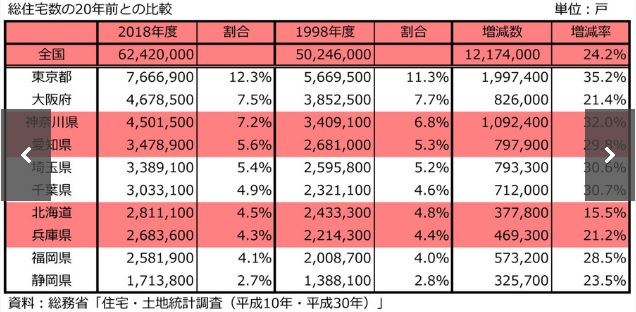 아래 표에 기재된 도부현은 인구순도 인구 증가순도 아닌, 주택수의 표와 동일한 순서로 되어 있습니다. 비율은 전국에 점유한 그 도도부현의 비율로, 증감숫자와 증감률은 1998년도와 비교한 2018년도의 숫자나 비율로 되어 있습니다.