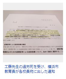 요코하마 시립 중학교의 교원이었던 남편의 과로사가 인정될 때까지 5년반의 시간이 걸렸습니다. 그 긴 시간후 구도요우코씨(52)는 요코하마시의 교육장으로부터 각 교장 앞으로 보내진 통지를, 알고 지내는 선생님으로부터 전해 받았습니다.