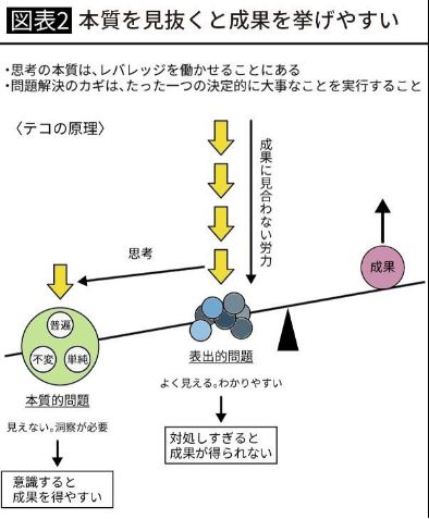 눈에 보이는 문제는 착수하기 쉬우나, 그에 대해 열심히 대처해도, 결과로써 얻어지는 성과는 적습니다. 그것도 물리적으로 상당히 큰 힘을 쓰지 않으면 안되며, 그걸로 일정한 성과를 얻었다고 해도, 문제의 근원에 메스를 들이대지 않았으므로 반드시 새로운 문제가 나옵니다. 그리고 결국, 두더지 잡기를 하는 것처럼, 계속 나오는 문제에 착수하지 않으면 안됩니다.